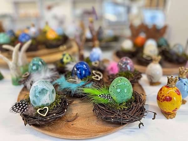 Dort gibt es tolle Oster-Dekoration aus Ton, Holz oder schönen Stoffen, passend zum internationalen Frauentag haben wir ein Glücksrad für alle Besucherinnen und Sie können auch viele weitere Werke unserer Künstlerinnen und Künstler erwerben.