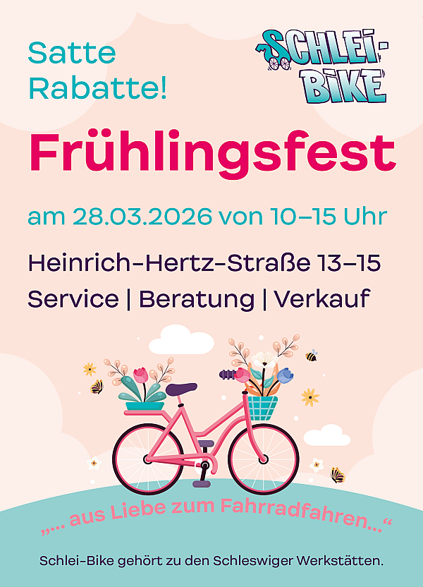 Wir laden Sie herzlich zur Saisoneröffnung im Schlei-Bike der Schleswiger Werkstätten ein! Am 28. März von 10 bis 15 Uhr erwarten Sie nicht nur satte Rabatte auf unsere E-Bikes, sondern auch ein buntes Rahmenprogramm für die ganze Familie.